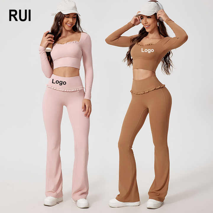 RUIQUWIN Ensemble de yoga 2 pièces sans couture pour femme, haut en dentelle et pantalon évasé, séchage rapide, évacuation de l'humidité, idéal pour le Pilates et la gym