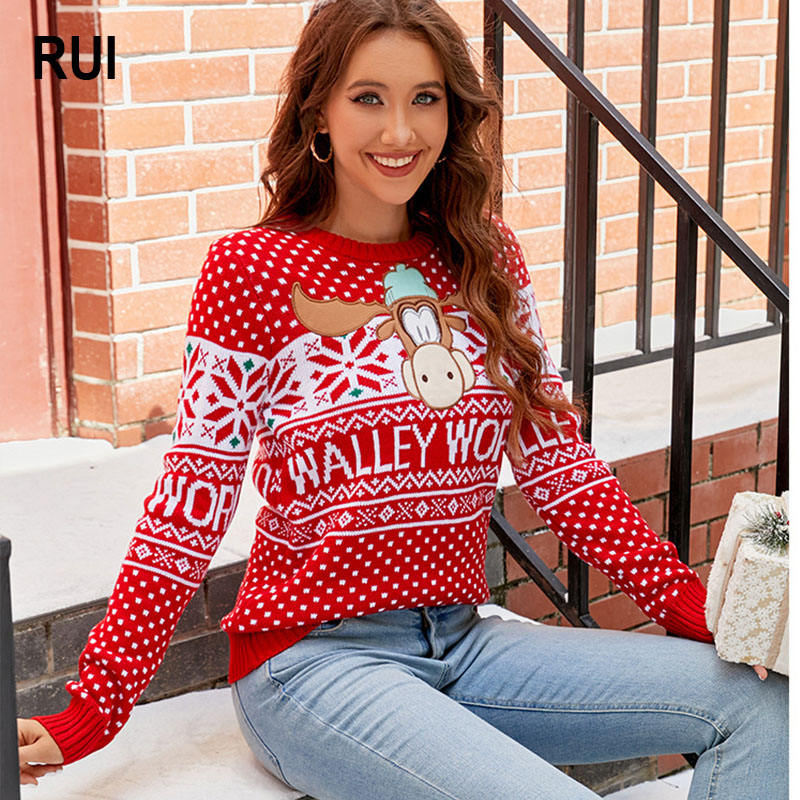 RUIQUWIN Custom Soft Round-Neck Breathable Vintage Pullovers Women's Casual Knit Sweaters Christmas Cartoon Appliques Front