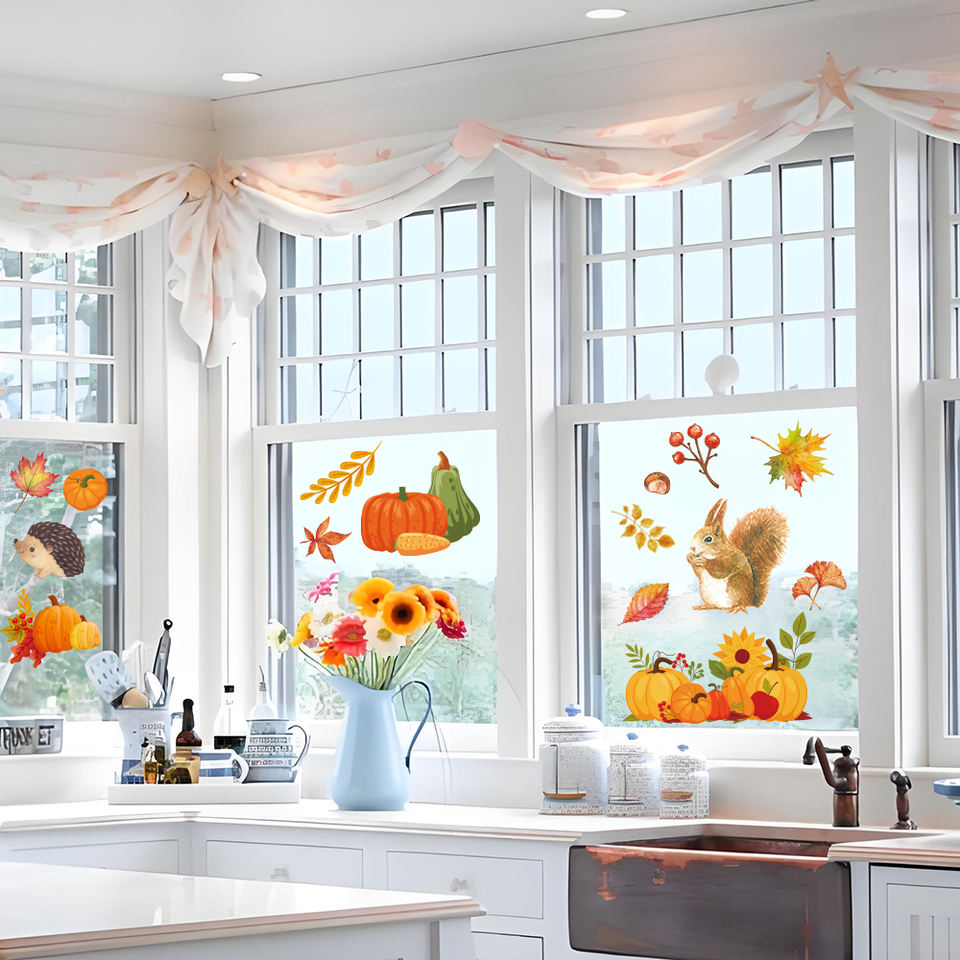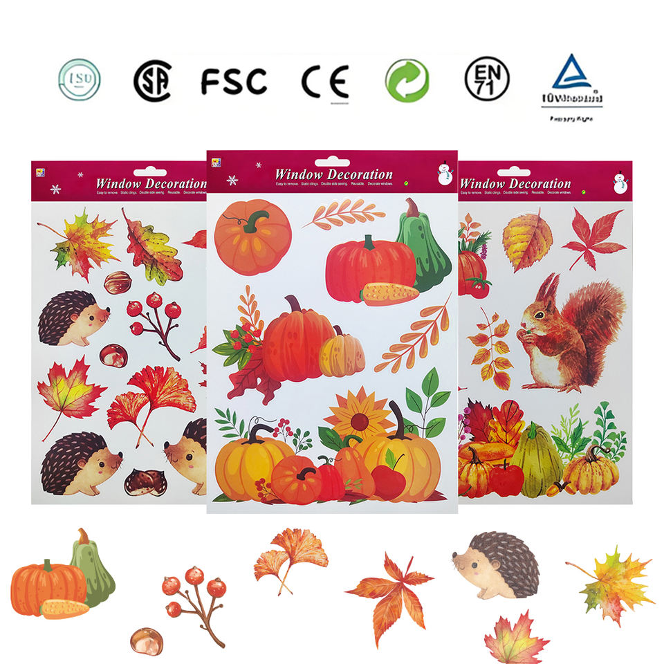 Rabbit Hedgehog Fall Leaves Pumpkin Autumn Window Static Film Stickers for Home School Office Party