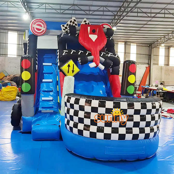 Château gonflable à thème voiture de course avec toboggan sec et zone de saut pour enfants, grand toboggan gonflable à vendre
