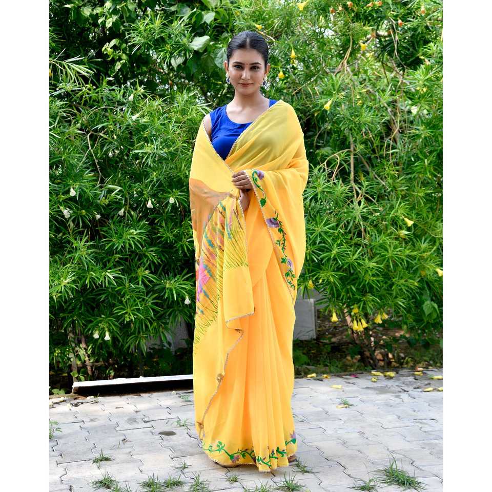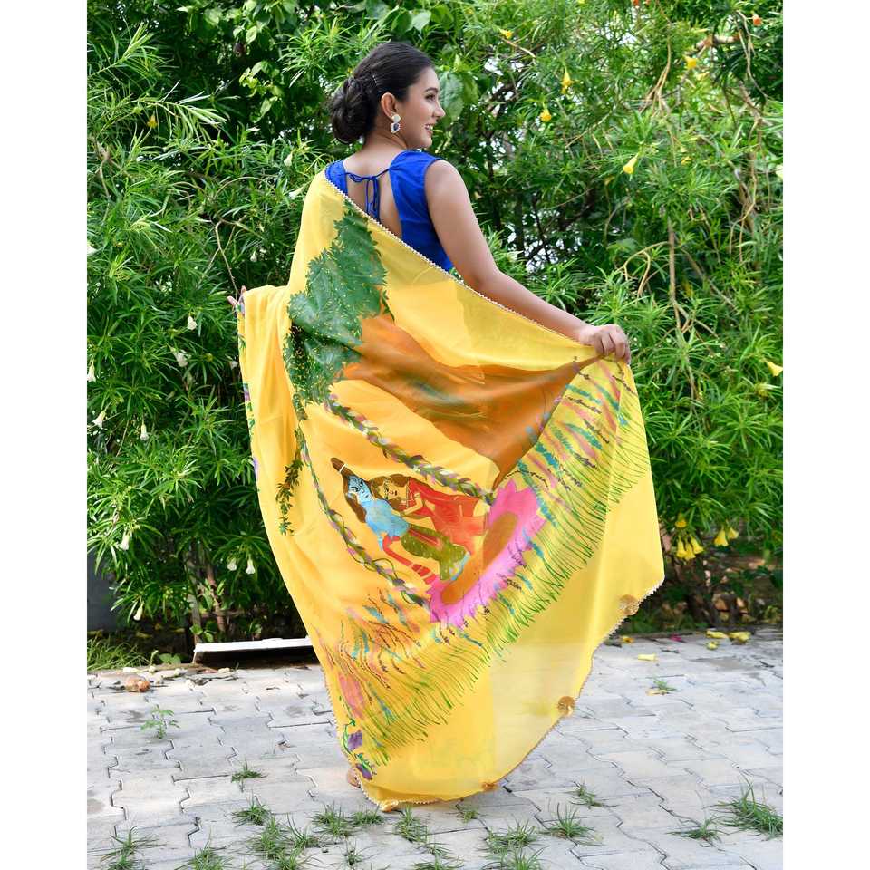 Sari jaune peint à la main Radhe, taille unique, pour les mariages