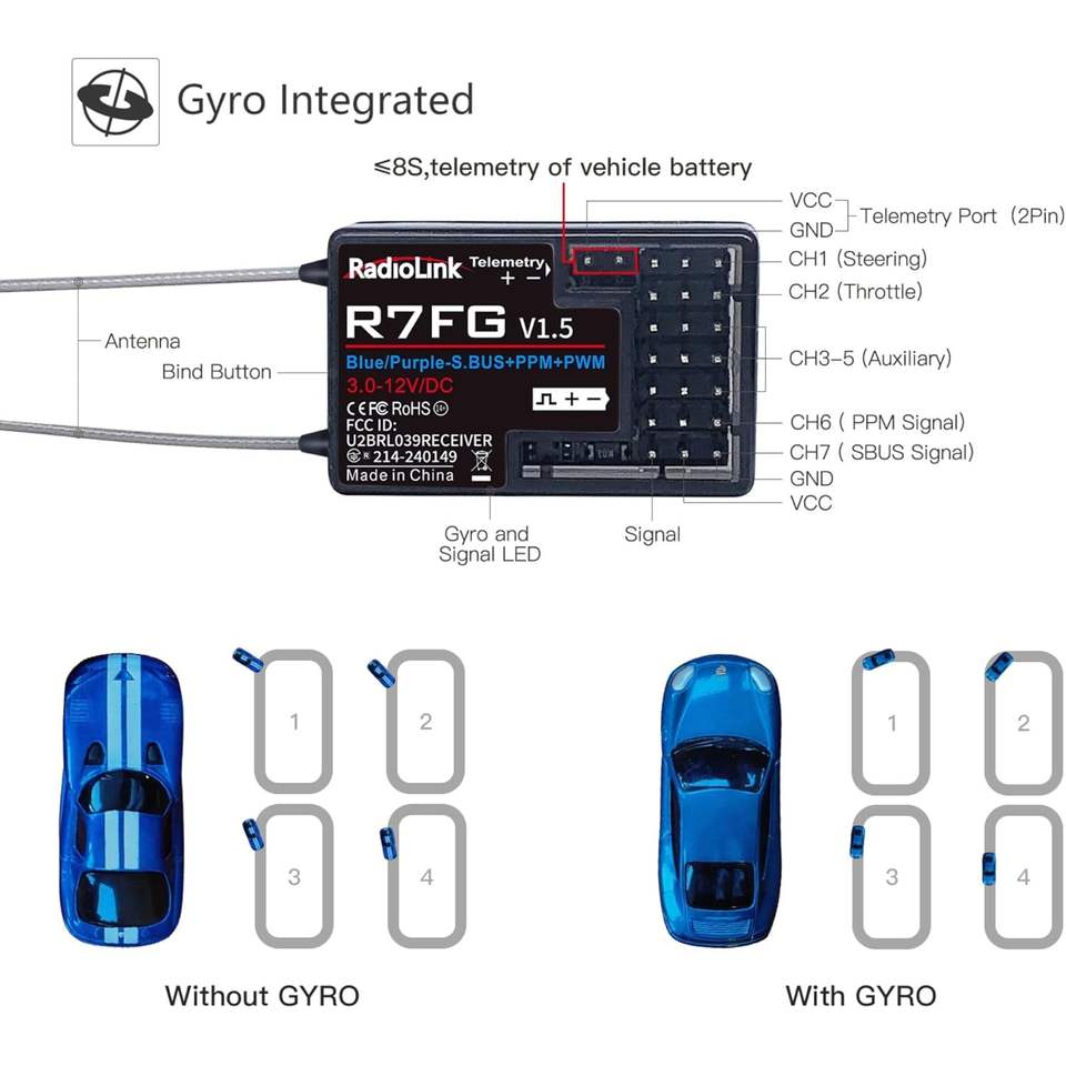 Radiolink R7FG Récepteur gyroscopique RC 7 canaux Jouet en métal résistant aux éclaboussures d'eau à longue portée pour chenille à la dérive Télémétrie Contrôle de tension