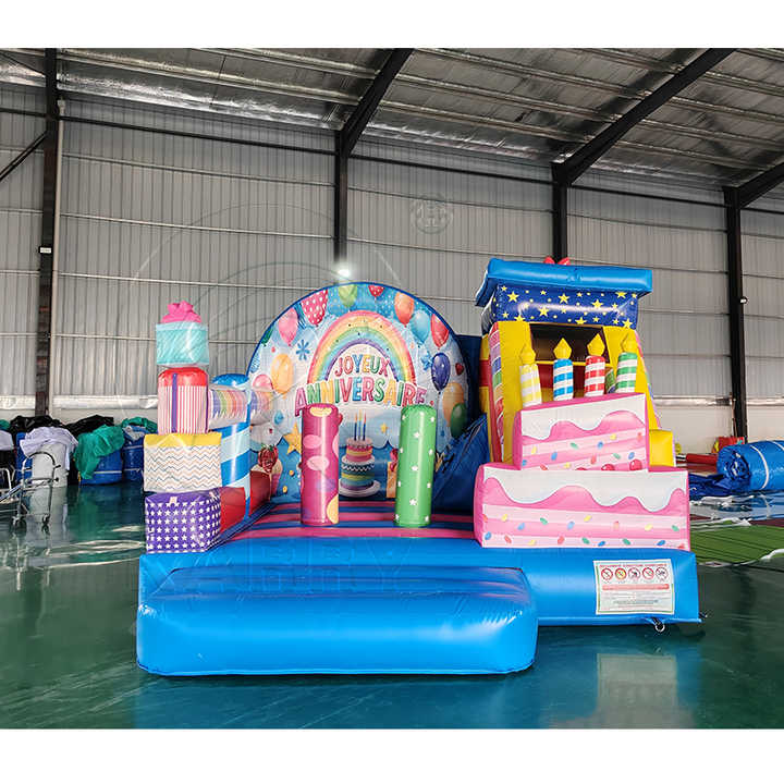 Château gonflable pour fête d'anniversaire arc-en-ciel avec gâteau et cadeaux, parfait pour les célébrations d'enfants, les jeux en intérieur et les événements festifs