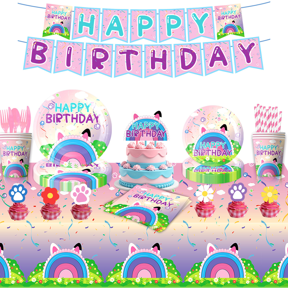 Ensemble de vaisselle arc-en-ciel pour fête des oreilles de chat Assiettes jetables mignonnes avec empreinte