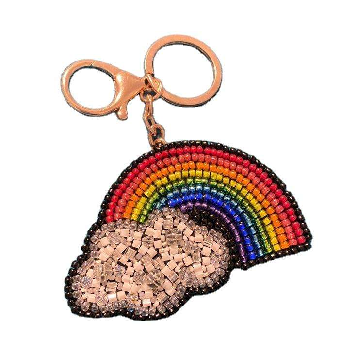 Breloque de sac brodée de perles de rocaille motif arc-en-ciel, style fait main, avec fermoir en métal doré, cadeau personnalisé, porte-clés
