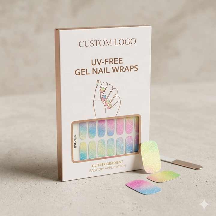 Bandes de gel pour ongles effet dégradé pailleté arc-en-ciel, 20 bandes, ombré pastel, sans UV, finition professionnelle de salon, ongles à presser, longue durée, 14+
