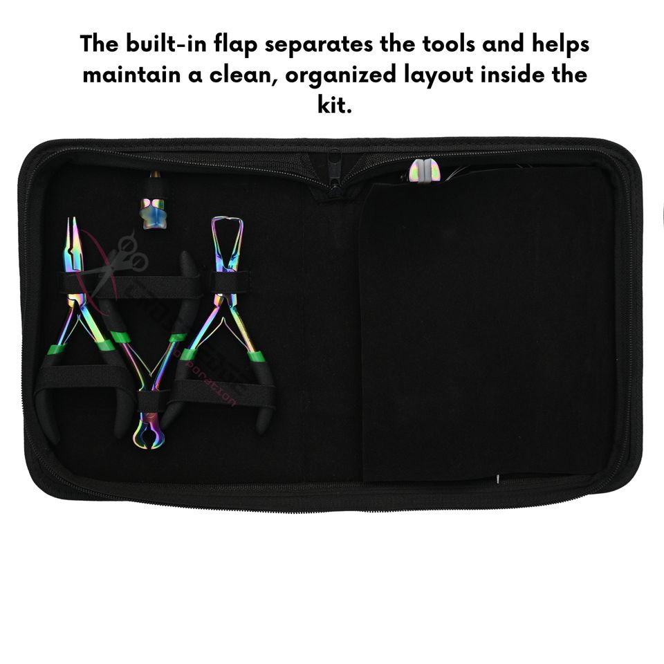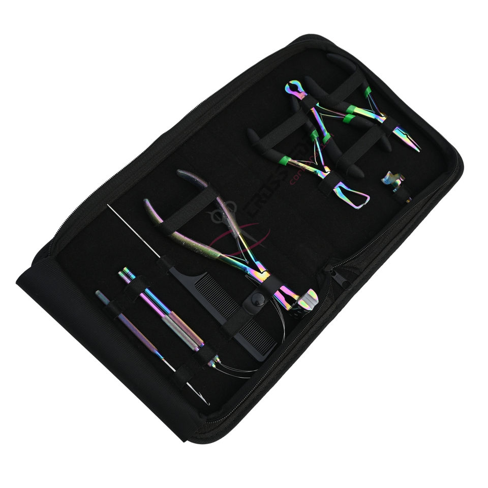 Kit d'outils pour extensions capillaires arc-en-ciel pour coiffeurs – Pinces multi-couleurs, outil à crochet et boucle, coupe-keratine, peigne à queue, doigtier