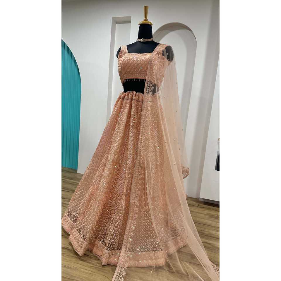 FB Peach Sequins & Dori Work Unstitched 1300g Lehenga Choli Party Wear Prom Dresses