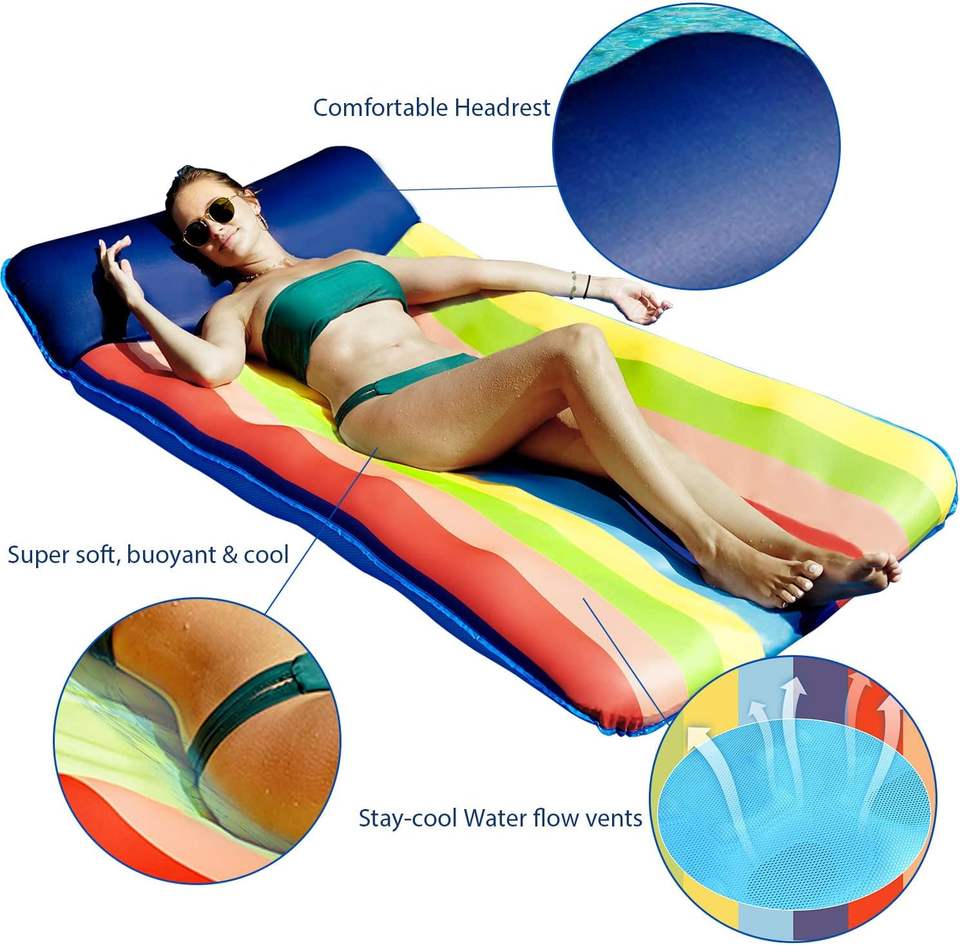 Matelas flottant gonflable en PVC à rayures arc-en-ciel avec trous en maille pour adultes, pour piscine et plage