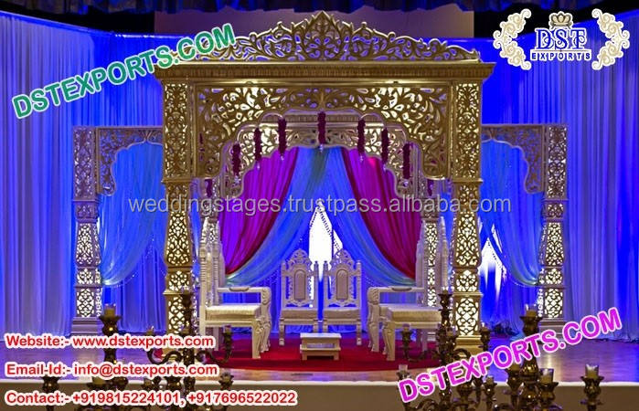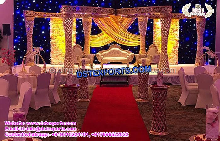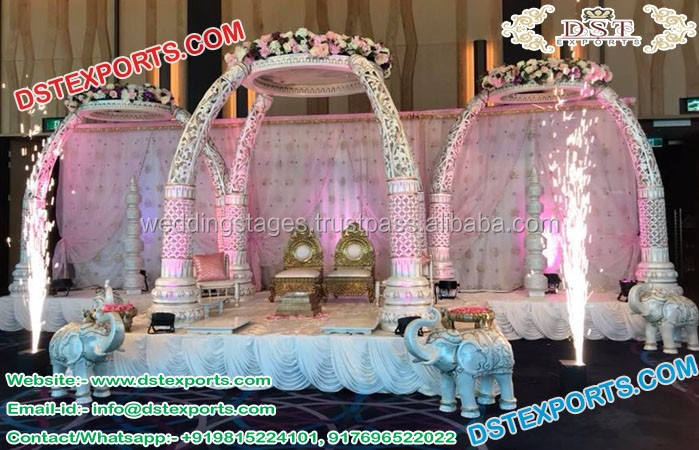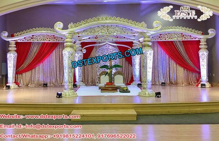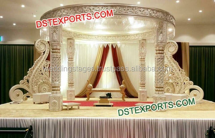 Mandap de mariage en argent Raj Mahal, style Jodha Akbar, mandap de mariage en fibre Jhronka, fabricant de mandaps de mariage, décoration de mariage USA