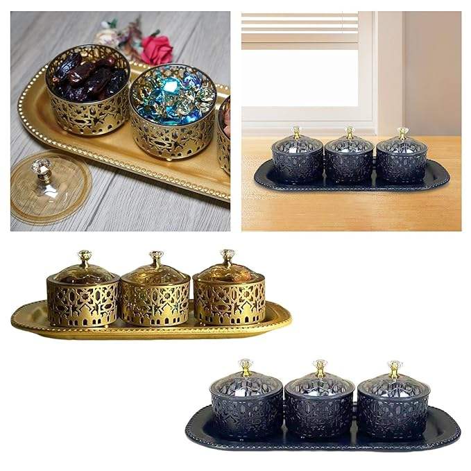 Ensemble de plateaux à bonbons circulaires en métal pour Ramadan, doré et noir, avec couvercle et poignée en cristal, pour fruits secs et noix, décoration de table de cuisine islamique
