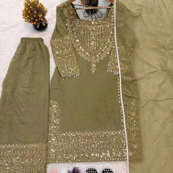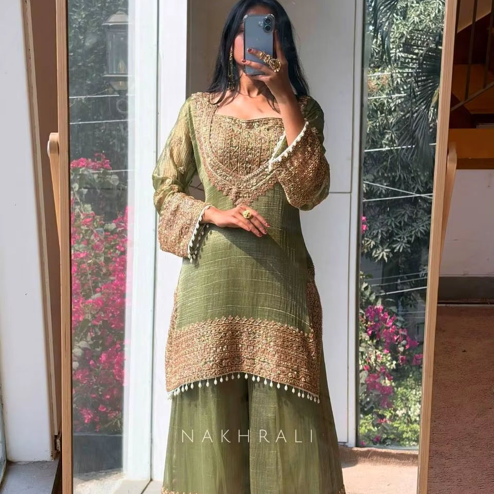 Ensemble Kurta Palazzo Moderne pour Femme en Soie Chiffon Lourde de Luxe Ramdev Trading, Brodé de Sequins 5mm, Séchage Rapide, Toutes Saisons