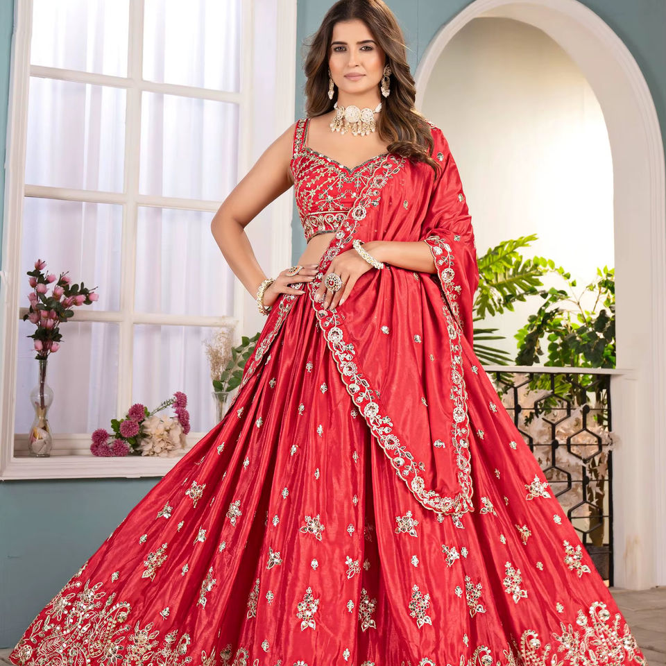 Ramdev Trading Lehenga Choli Dupatta en Georgette et Chinon Rouge, avec broderie traditionnelle de designer et travail de sequins, en matériaux recyclés
