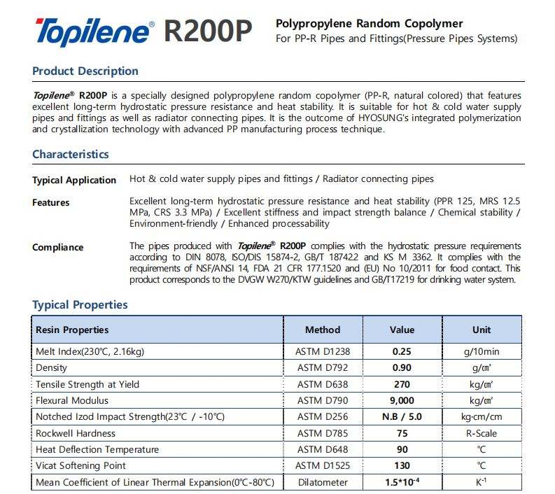 Granules de polypropylène de copolymère aléatoire R200P granules vierges de matière première de polypropylène en plastique pp pour le tuyau d'eau chaude et froide