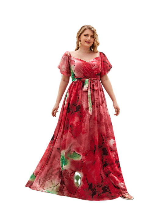 Robe en mousseline élégante et gracieuse à manches lanternes, col en V, imprimé numérique à l'aquarelle florale coupée au hasard, avec ceinture