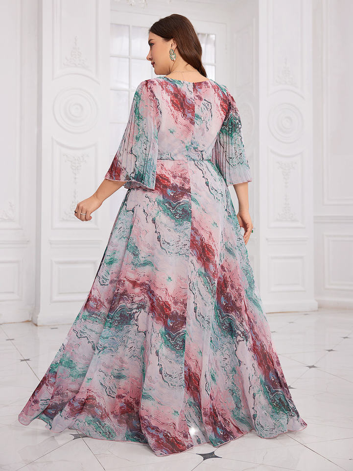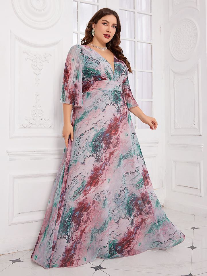 Robe de soirée élégante à col en V en mousseline de soie plissée à manches cloche, motif floral coupé au hasard, teinture par immersion, imprimé numérique de flou végétal