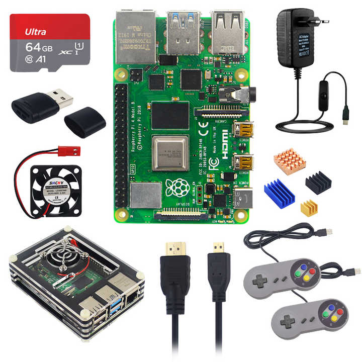Kit de jeu Raspberry Pi 4 + Gampads + carte TF 64 32 GB + boîtier en acrylique + ventilateur + interrupteur d'alimentation + câble compatible HD pour RPi 4