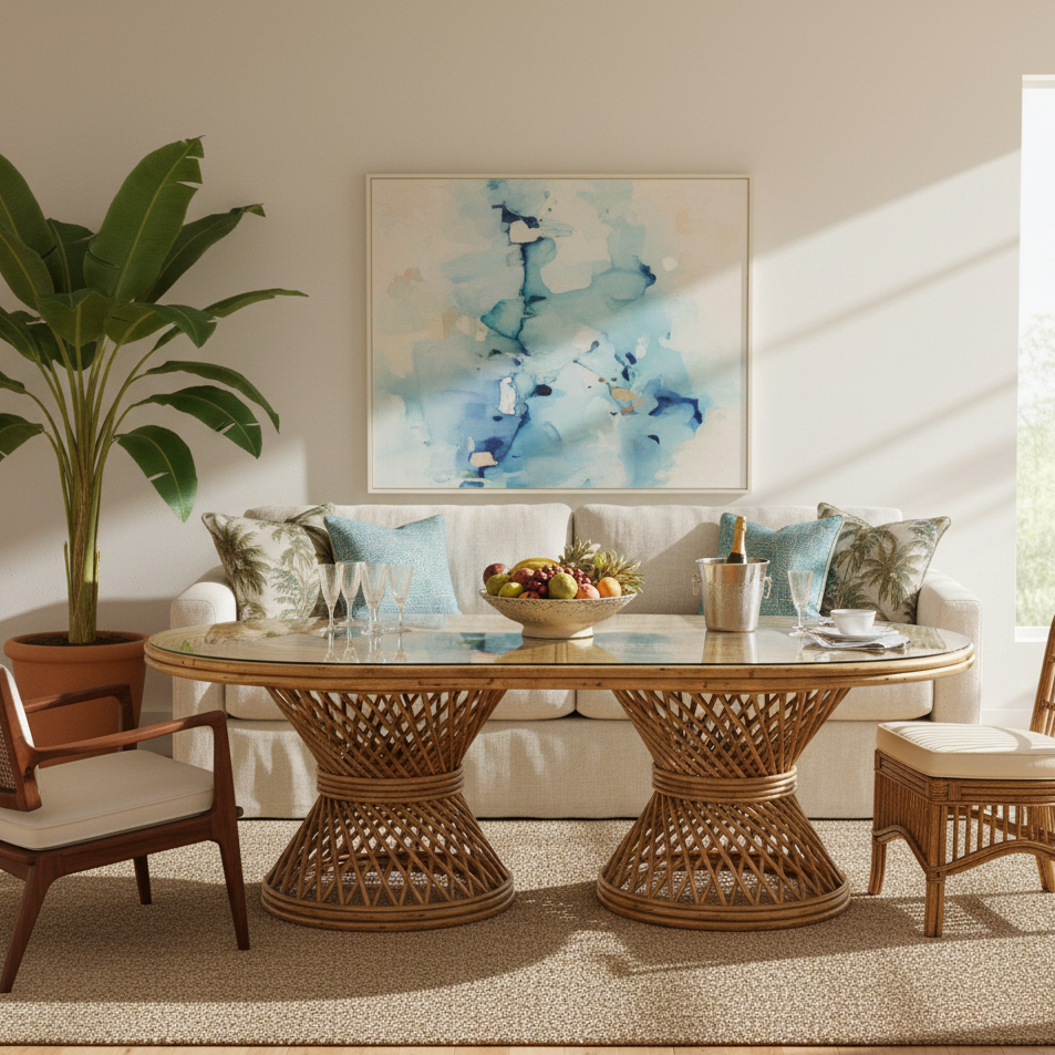 Table à manger d'extérieur en rotin, grande et large, écologique, durable, confortable, minimaliste, pour villa, ferme, appartement et hôtel