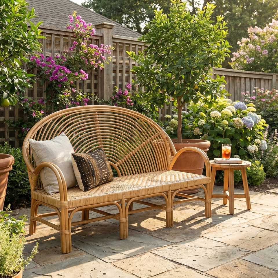 Banc en rotin pour l'extérieur, utilisation en salle à manger et à l'hôtel - Design minimaliste, confortable et durable, respectueux de l'environnement, utilisation dans le salon et au parc