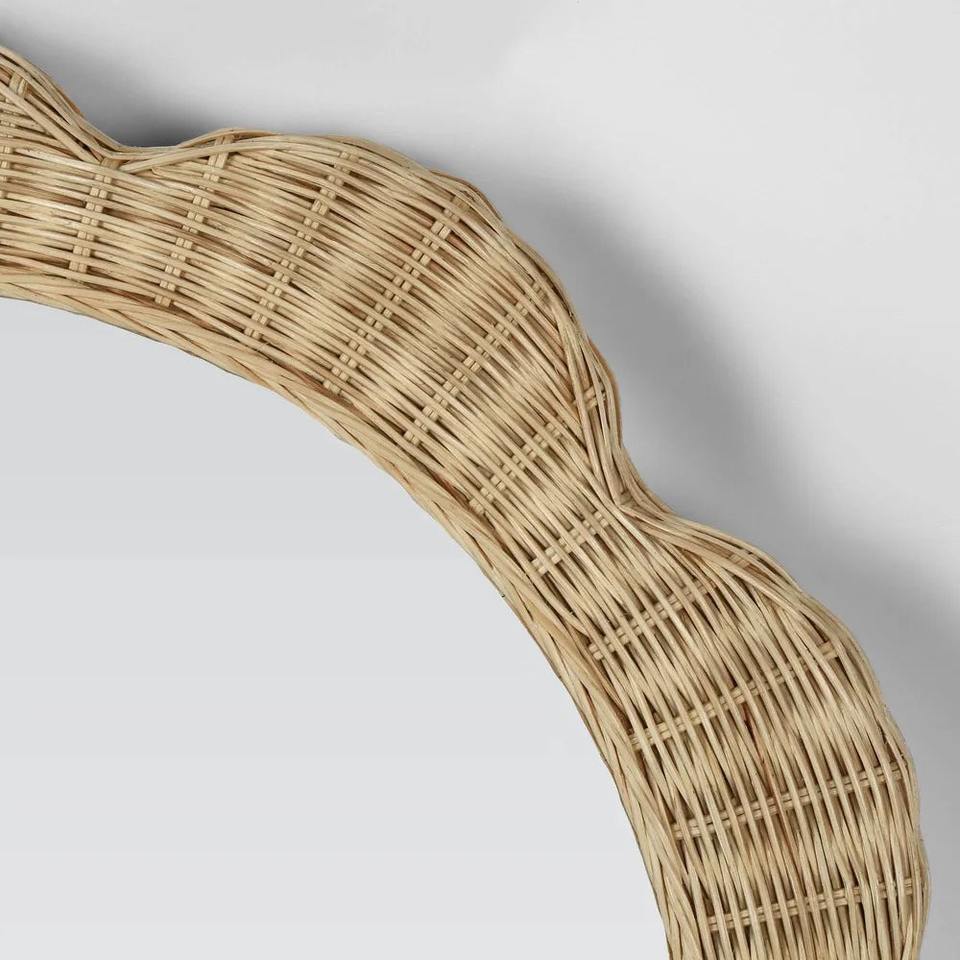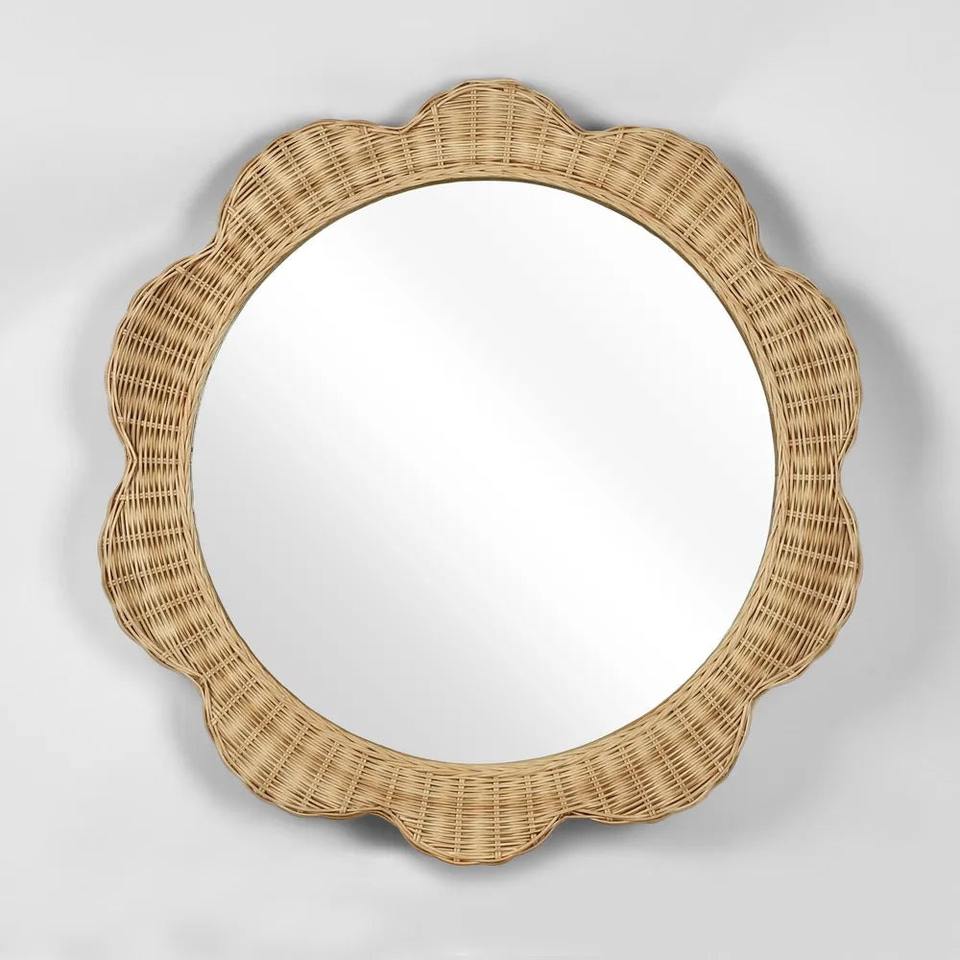 Miroir mural rond en rotin avec bordure fleurie, cadre tissé à la main, décoration d'intérieur, vente en gros, fournisseur durable