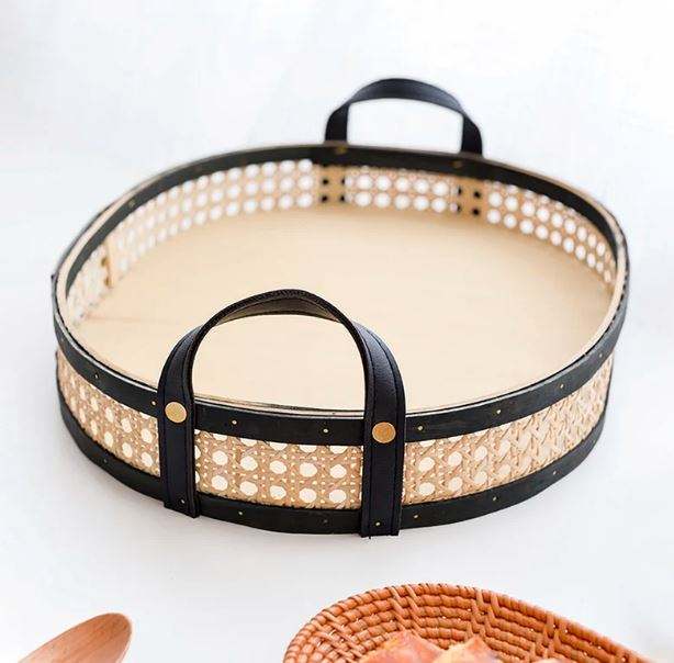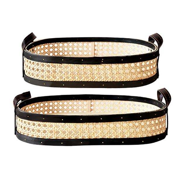 Plateau de service en rotin avec cadre en bois parfait pour les ustensiles de cuisine à la maison et le service des aliments