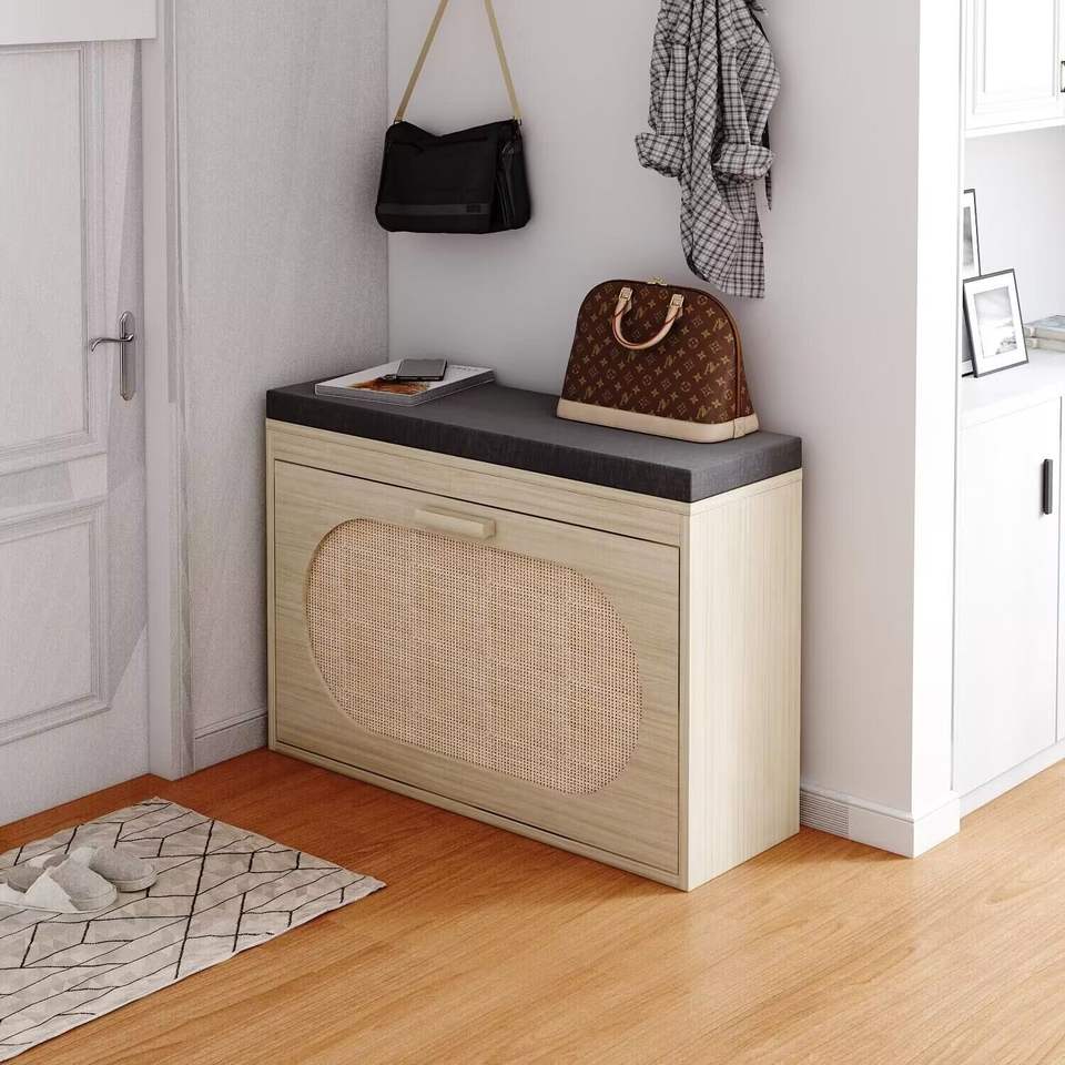 Meuble à chaussures en rotin avec tiroir rabattable et coussin de siège, banc à chaussures pratique pour le couloir