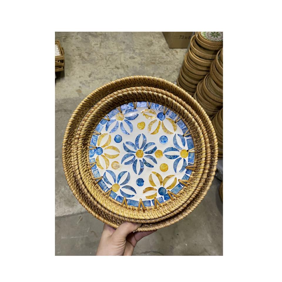 Plateau en rotin avec incrustation de nacre Plateau de service rond décoratif 30cm ou 35cm Décor Boho fait à la main Plage Thème Maison Naturelle