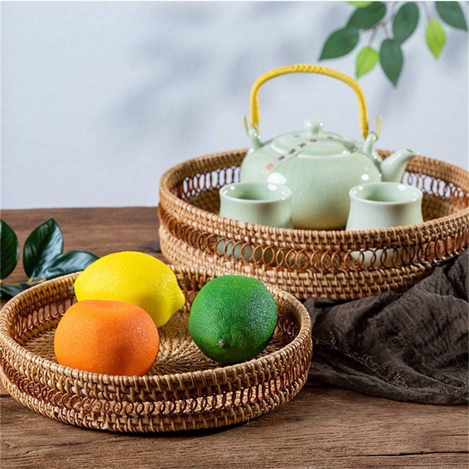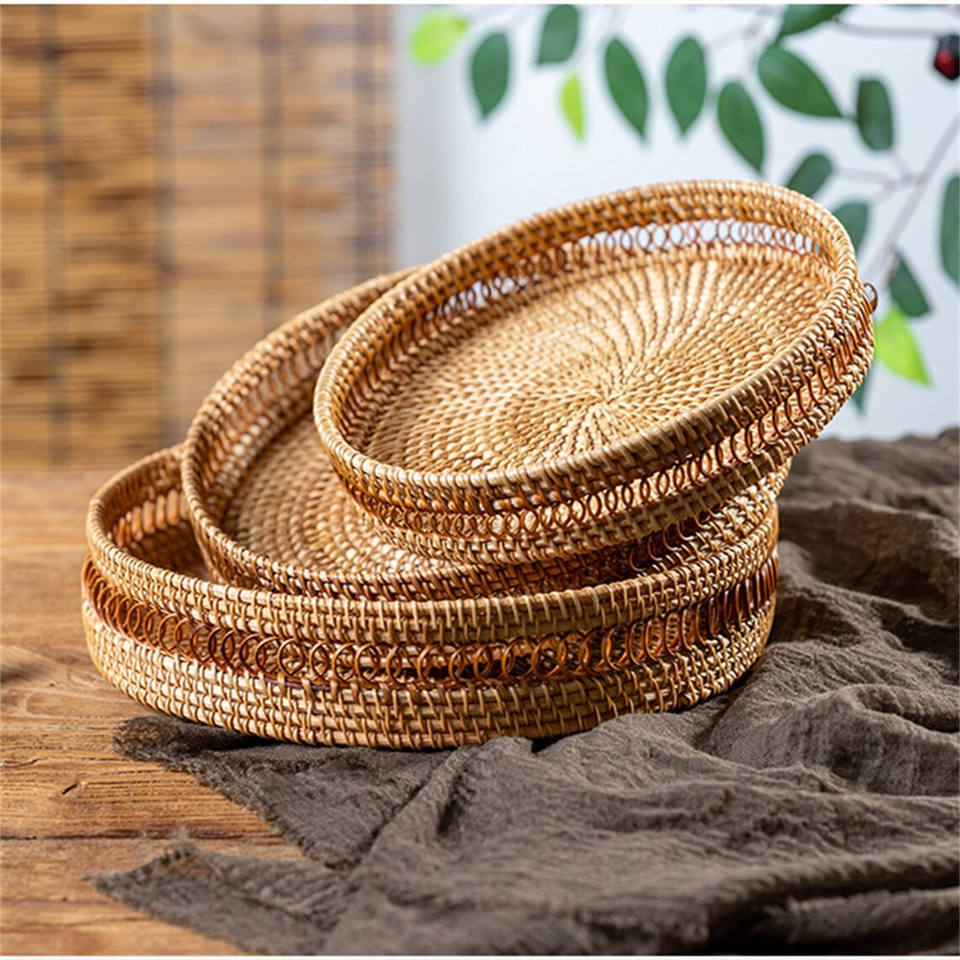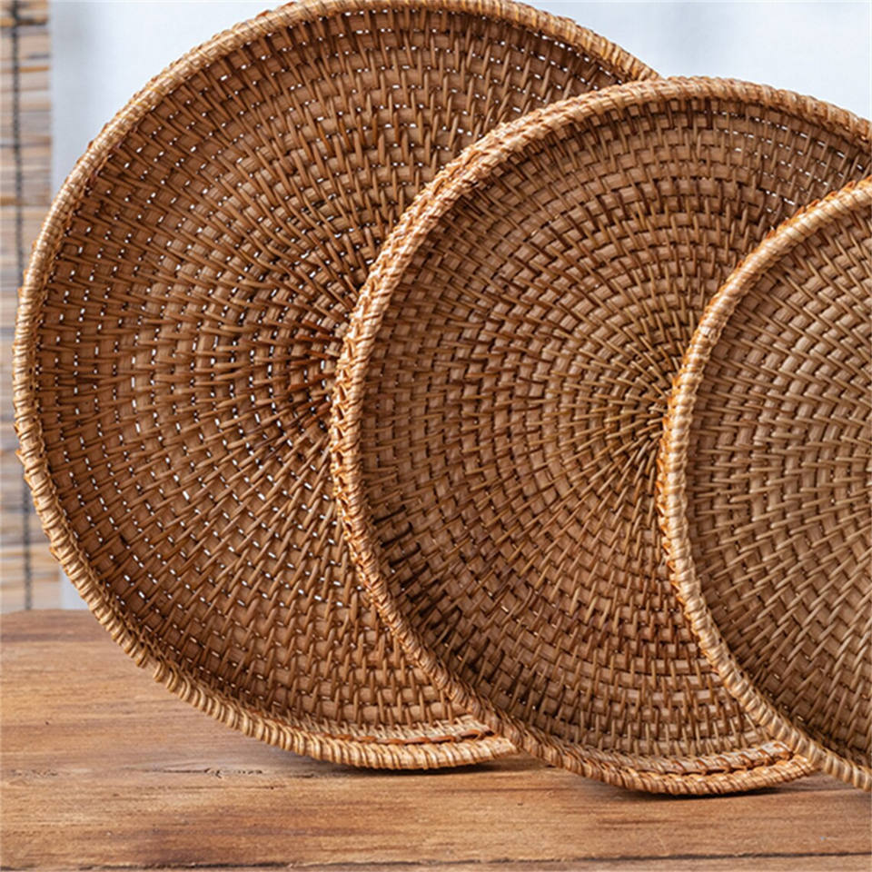 Panier de rangement rond tissé en rotin fabriqué à la main bureau fruits pain noix bonbons plateau de rangement plateau de collation pour enfants