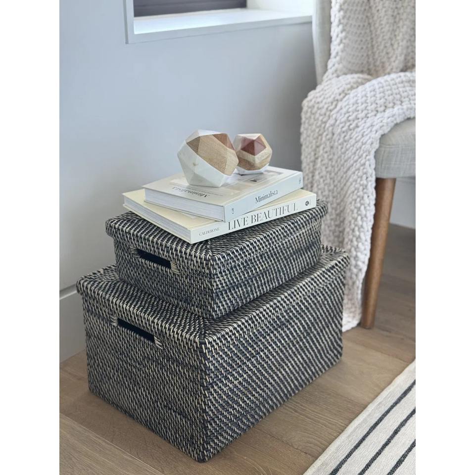 Nom:Boîte de rangement en rotin Taille : L18,5 x L14 x H10 pouces M : L17 x L13 x H9 pouces