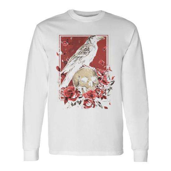 T-shirt gothique à manches longues Raven Crow, motif oiseau sombre, crâne et rose, esthétique grunge
