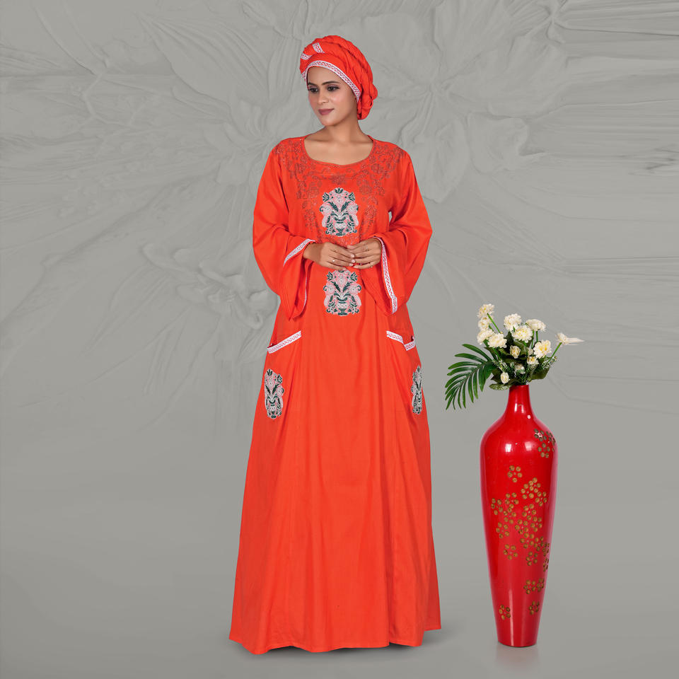 Kaftan Modeste en Rayonne Brodé avec Motif Frontal Élégant, Bordures de Manches Décoratives, Poches Fonctionnelles – Robe Quotidienne Aïd Ramadan