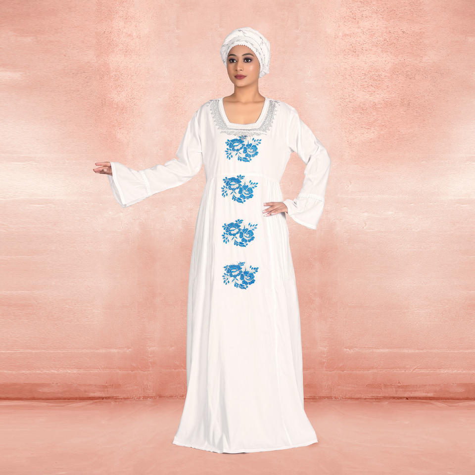 Kaftan Modeste en Rayonne Brodé avec Motifs Festifs pour l'Aïd, Col Rond, Manches Évasées, Silhouette Longue