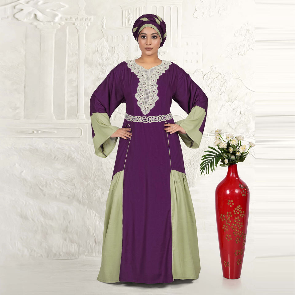 Kaftan en rayonne modeste avec encolure en dentelle complexe, panneaux contrastants bicolores, manches cloche décontractées, respirant, longueur ras du sol, pour l'Aïd