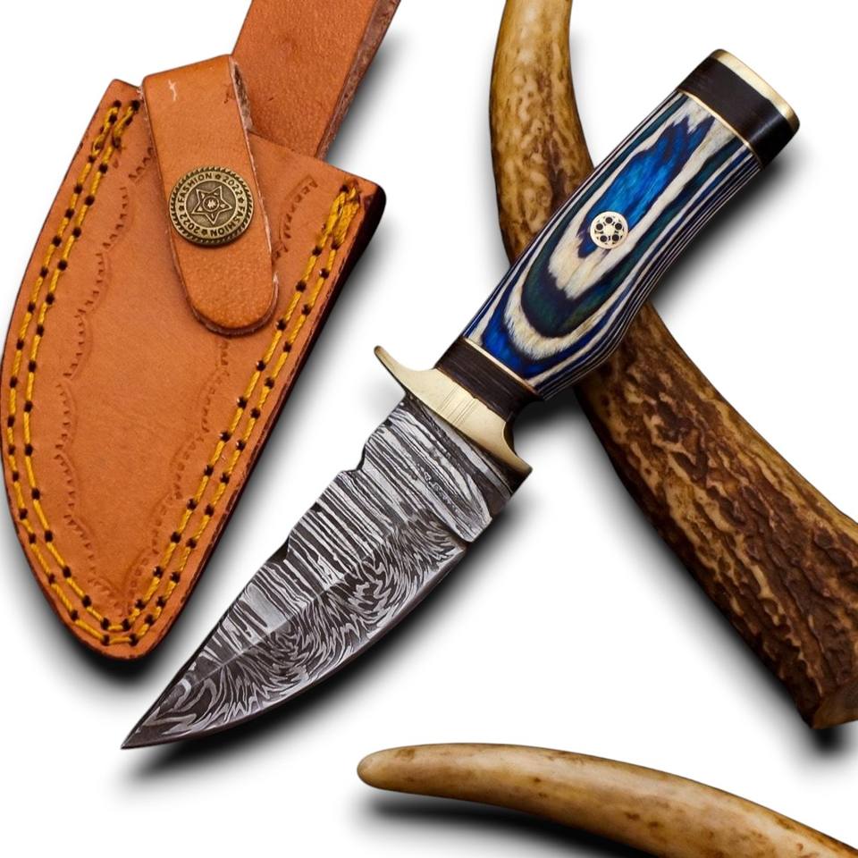 Razor Sharp Damascus Steel Fixed Drop Point EDC Knife Blue Pakka Wood Handle Brass Guard Premium OEM/ODM Skinner Camping Knife