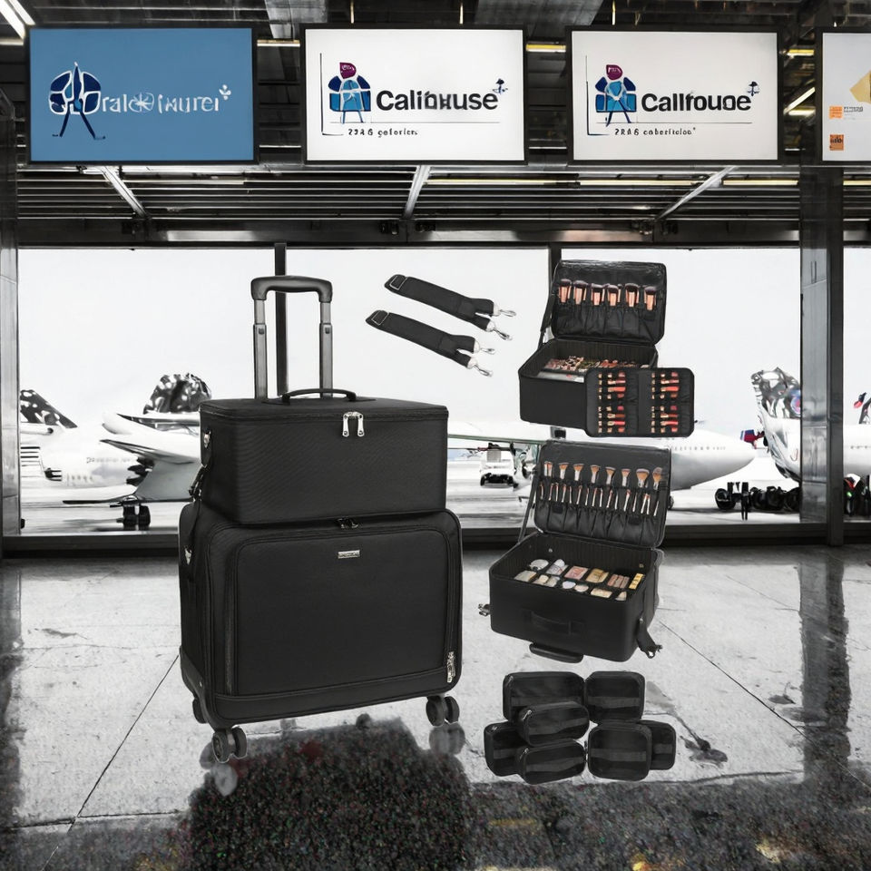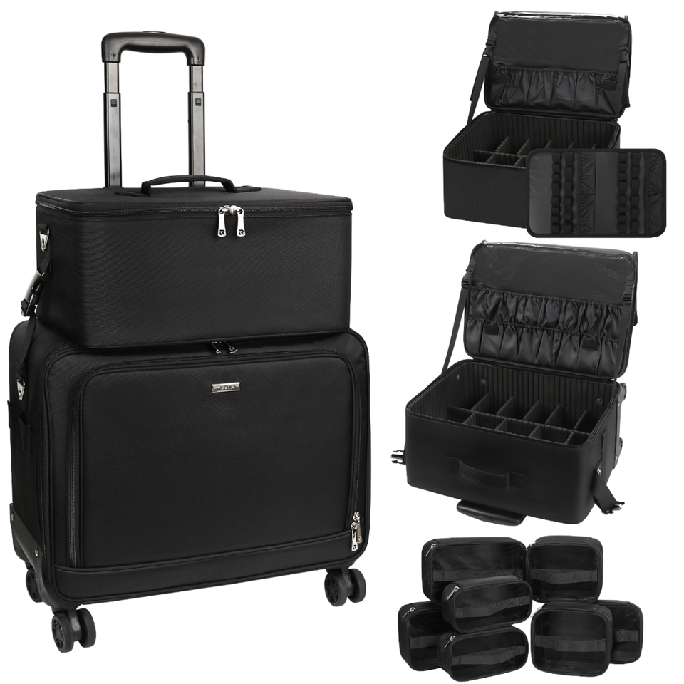 ReIaveI Grande Valise de Maquillage Professionnelle en Nylon Durable, Chariot à Roulettes pour Cosmétiques, Compartiments Ajustables, Fermeture Éclair, Étui de Voyage