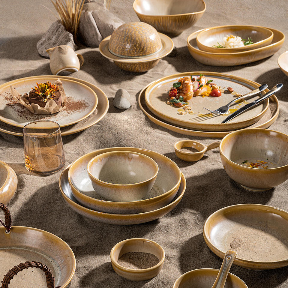 Ensemble de vaisselle glaçure réactive pour restaurant usage domestique vente en gros ensemble de vaisselle de salle à manger décontracté plat unique assiette ambre