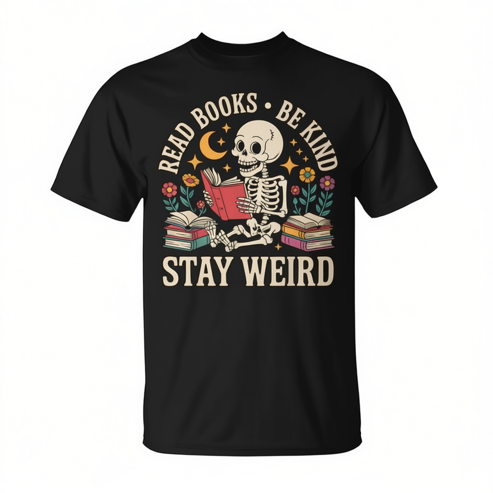 Lire des livres, être gentil, rester bizarre, t-shirt avec motif de squelette lisant un livre