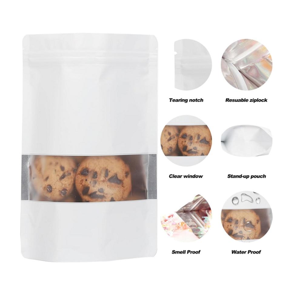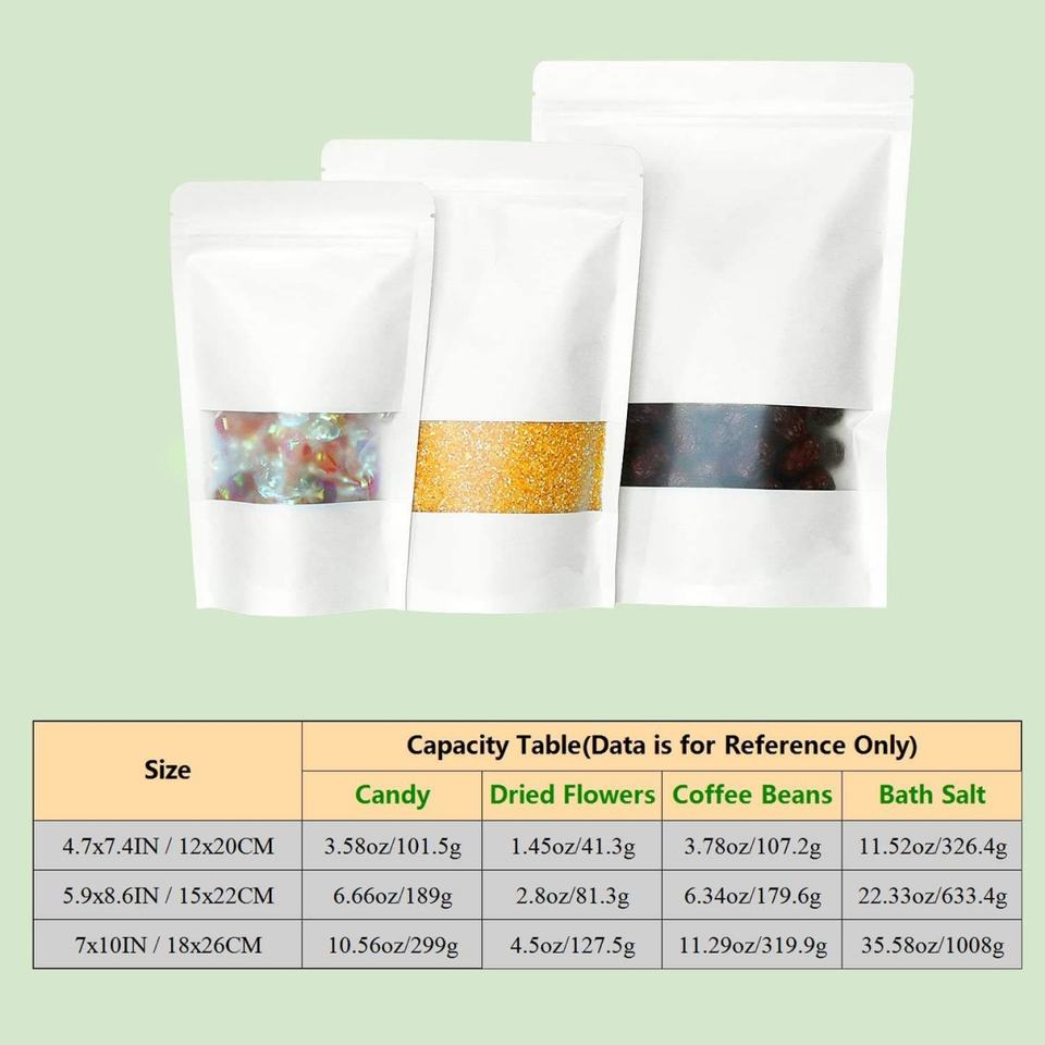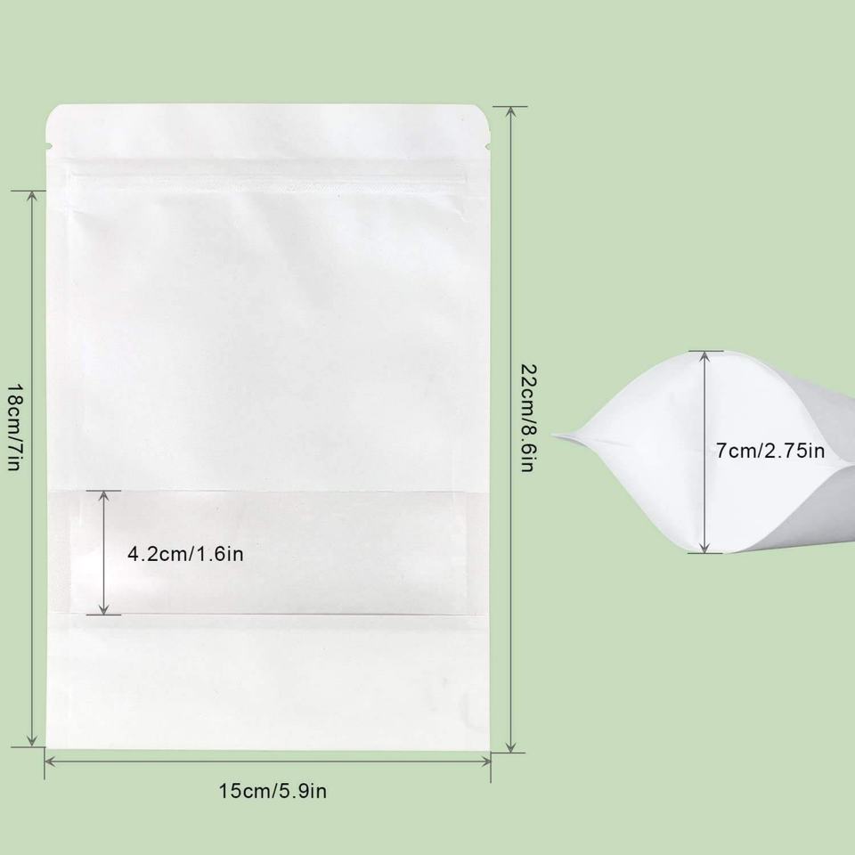 Sacs alimentaires refermables biodégradables prêts à l'emploi, Doypack personnalisé, sac en papier kraft blanc avec fenêtre, pochette en papier kraft