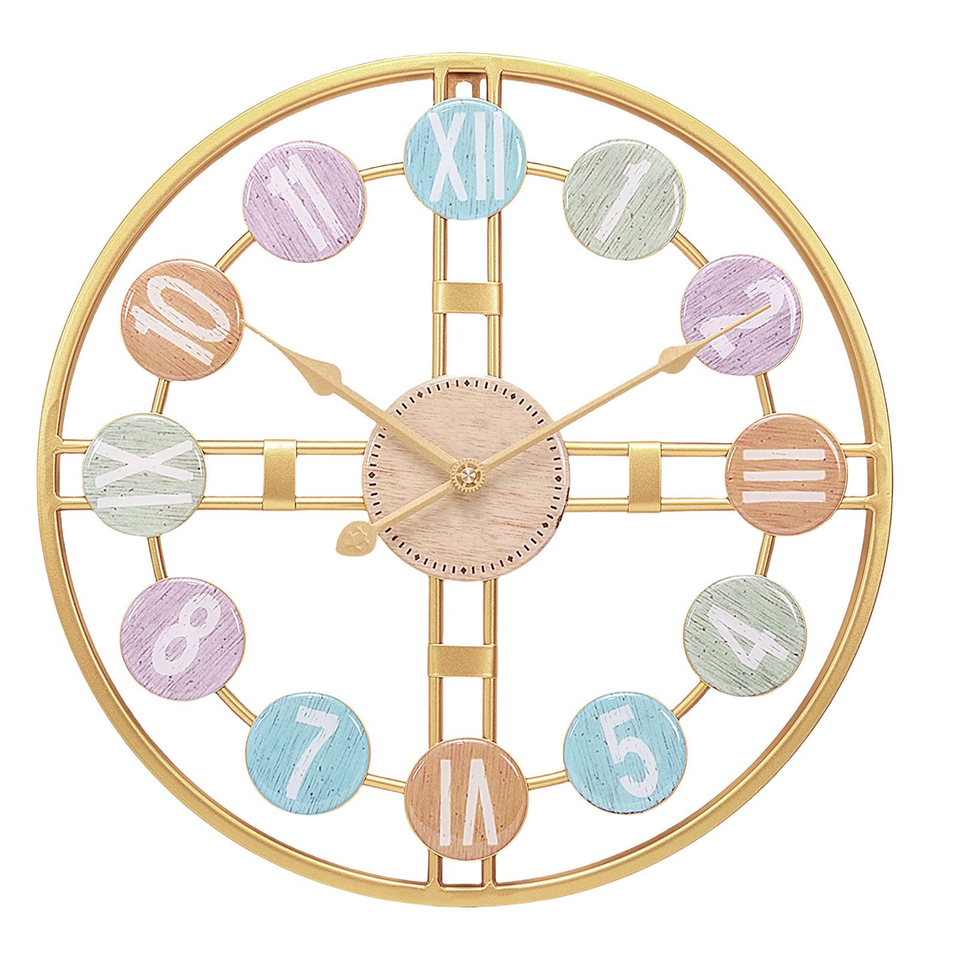 Horloge murale colorée avec chiffres romains et numériques, cadre doré, style rustique moderne, décoration pour salon et bureau, prête à la vente