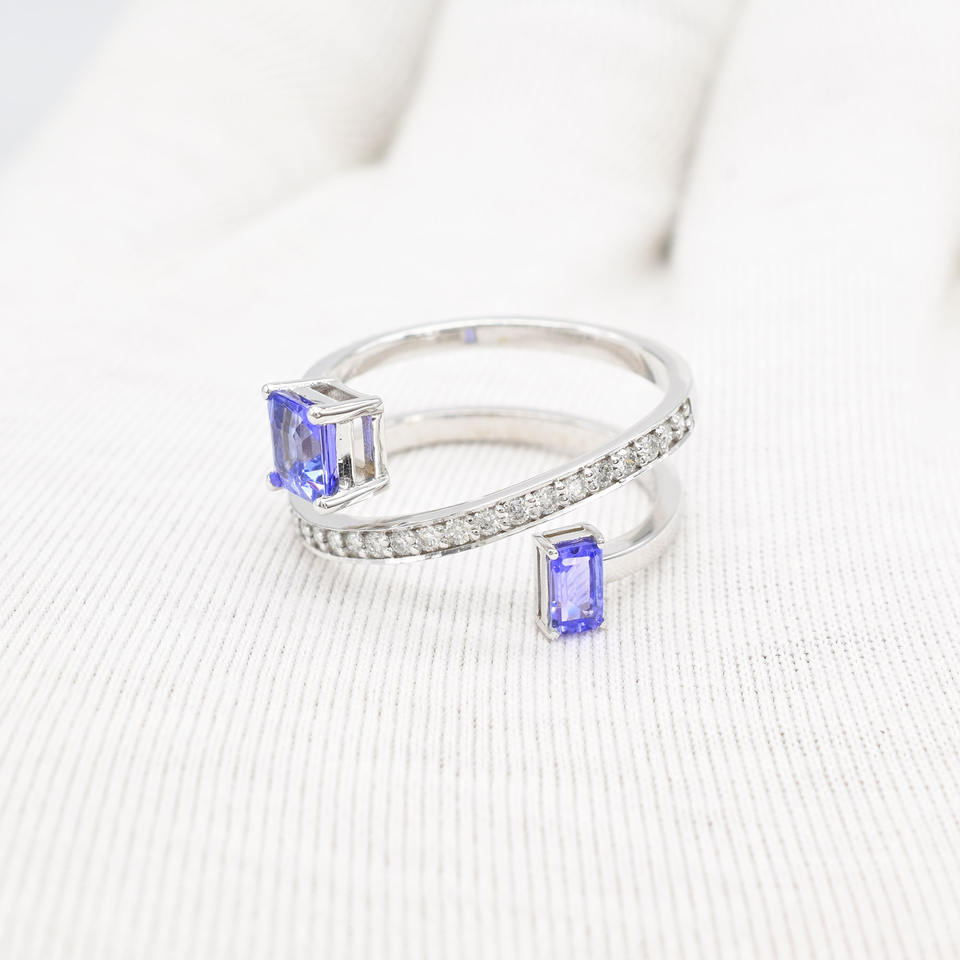 Bague Crossover Prête à Expédier, Authentique, 1,08 CTW, Tanzanite et Diamant Taille Carrée, Empilable, en Or Blanc Massif 14 carats, Bijoux