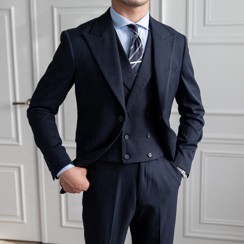 Costumes d'affaires italiens pour hommes de haute qualité, prêts à être expédiés, 3 pièces, bleu marine uni, costumes de mariage, blazers