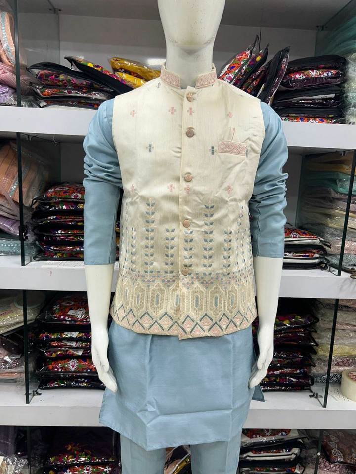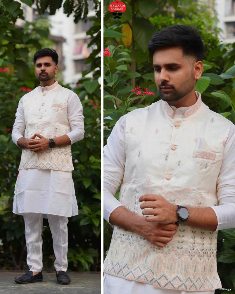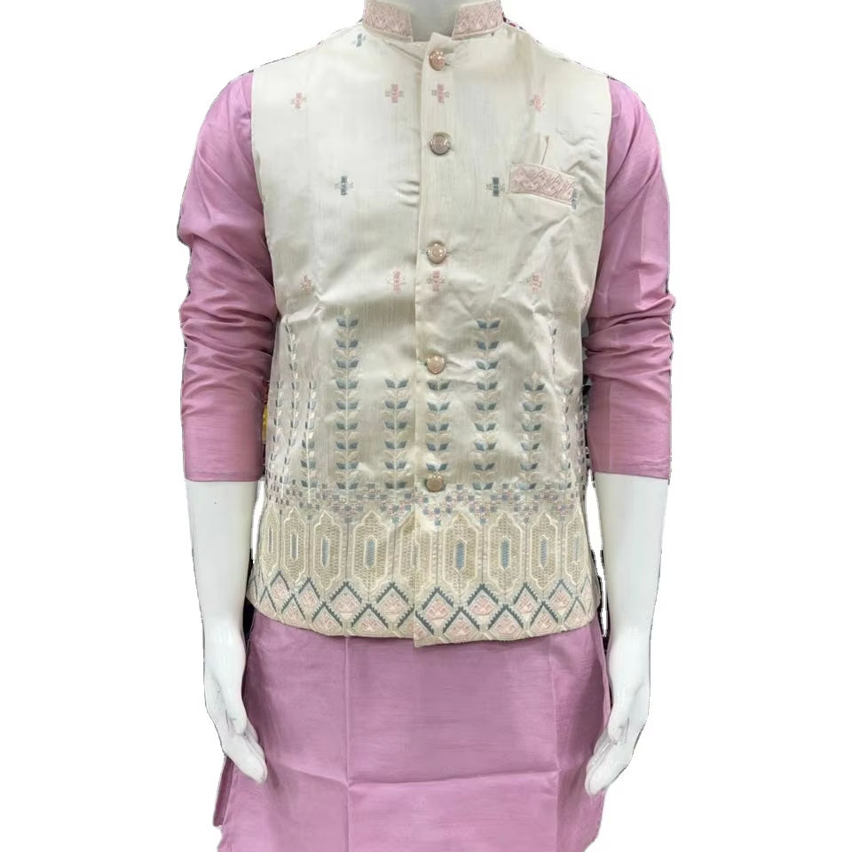 Prêt à Porter Fête de Mariage Causal Wear Hommes Banglori Soie Kurta & Bas Avec Différents Manches Motif Point