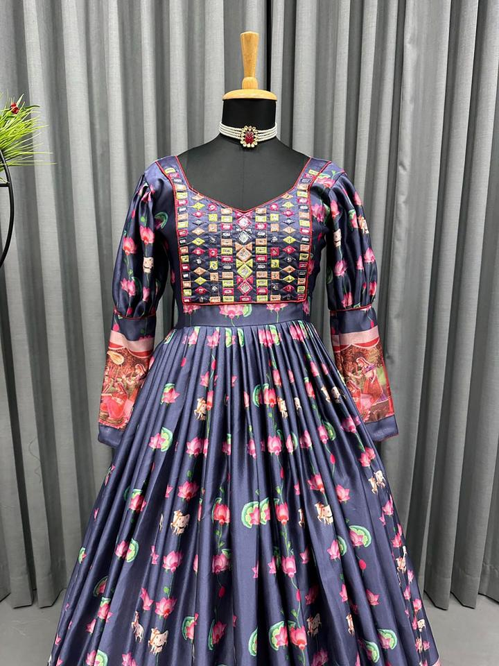 Ensemble de robe longue indienne Readymade et Dupatta, Gota Zari bleu marine à coutures complètes avec impression numérique pour fête, tenue de mariage pour femme
