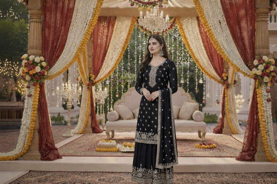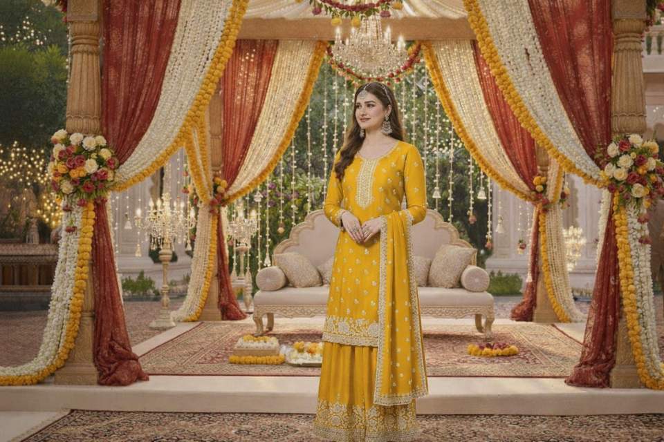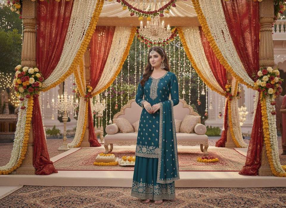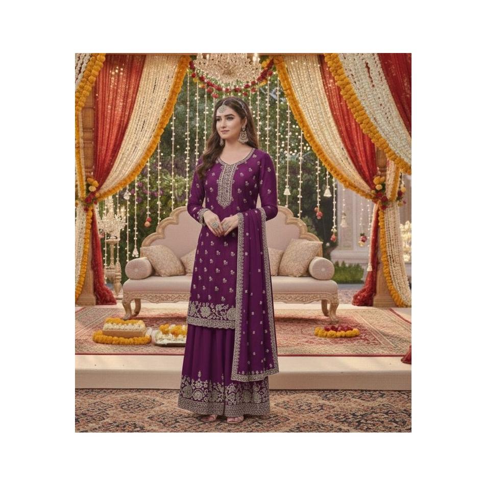Vrai chinnon avec broderie, travail de séquence de 3 mm, costume palazzo pour mariage et occasions de fête, costume palazzo pakistanais