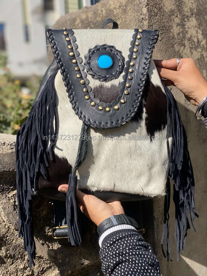 Sac à dos unisexe en cuir de vachette véritable fait à la main sac à dos Western à franges avec cordon de serrage