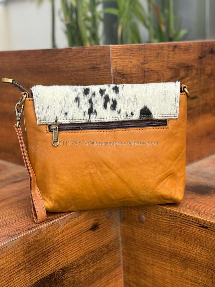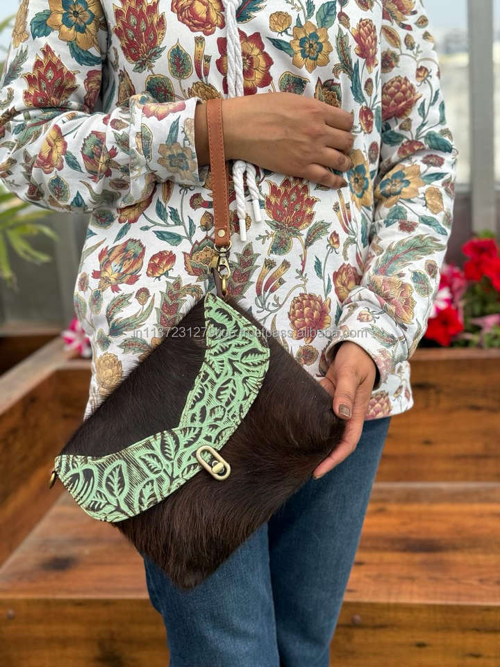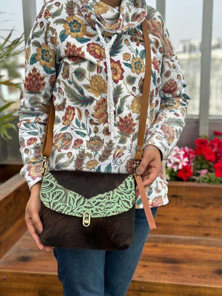 Real Handmade Western Style Cowhide Fur Embossed Print Leather Sling Bag Women Unique Tooled Fur Leather Vintage Casual Handbag