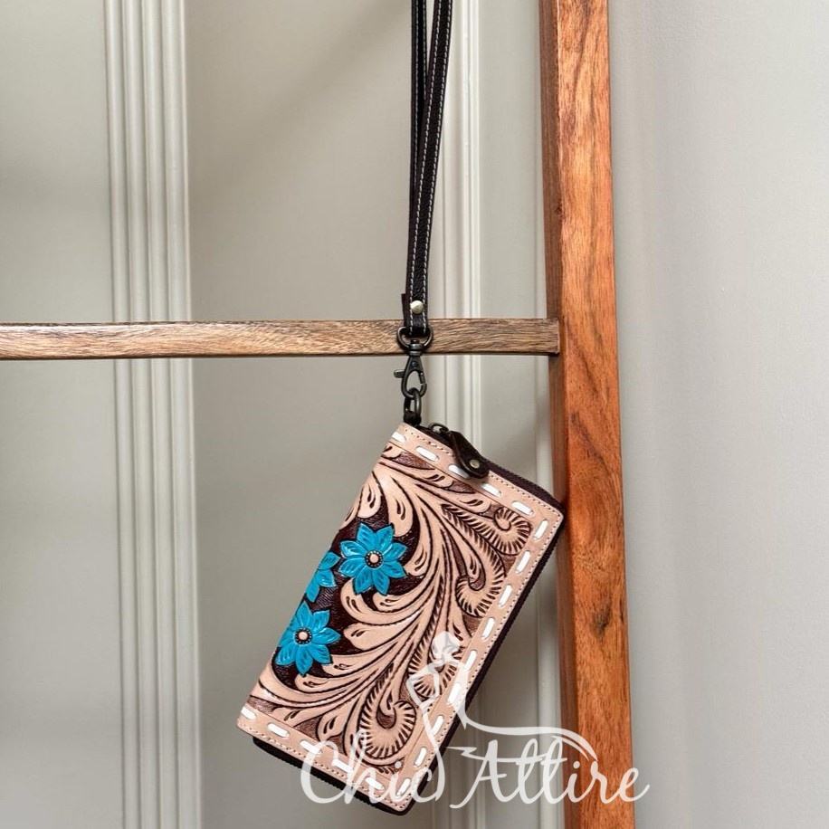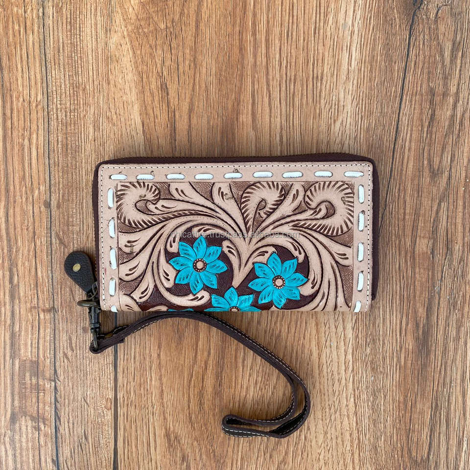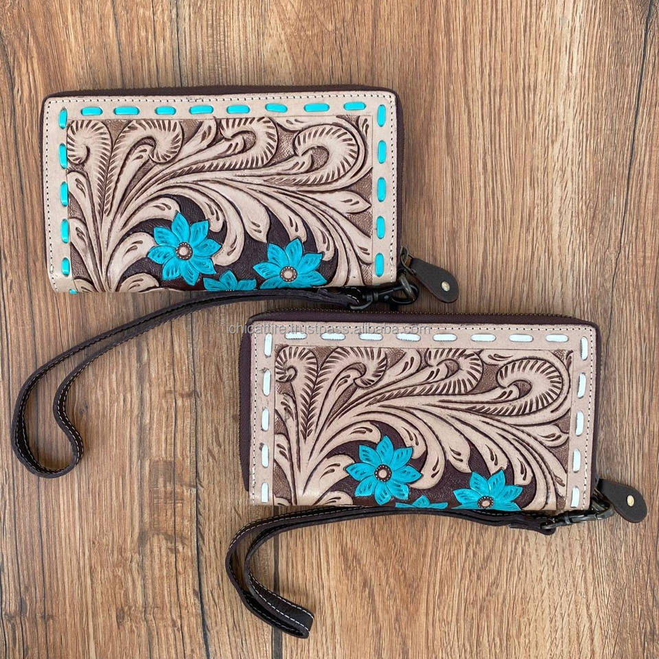 Portefeuille en cuir véritable taillé à la main sculpture portefeuille fleur turquoise multi-usages portefeuilles Offre Spéciale multi-usages pour femmes