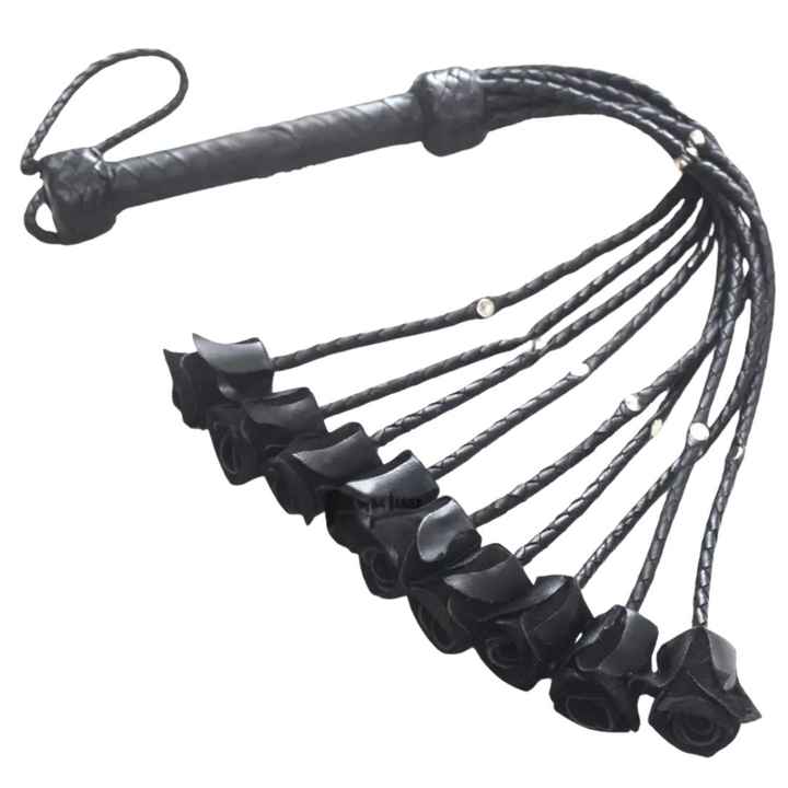 Flogger en véritable peau de mouton avec poignée lisse et arrondie, boucle en acier, largeur 2,5 cm, détection par aiguille, plusieurs cordons flexibles