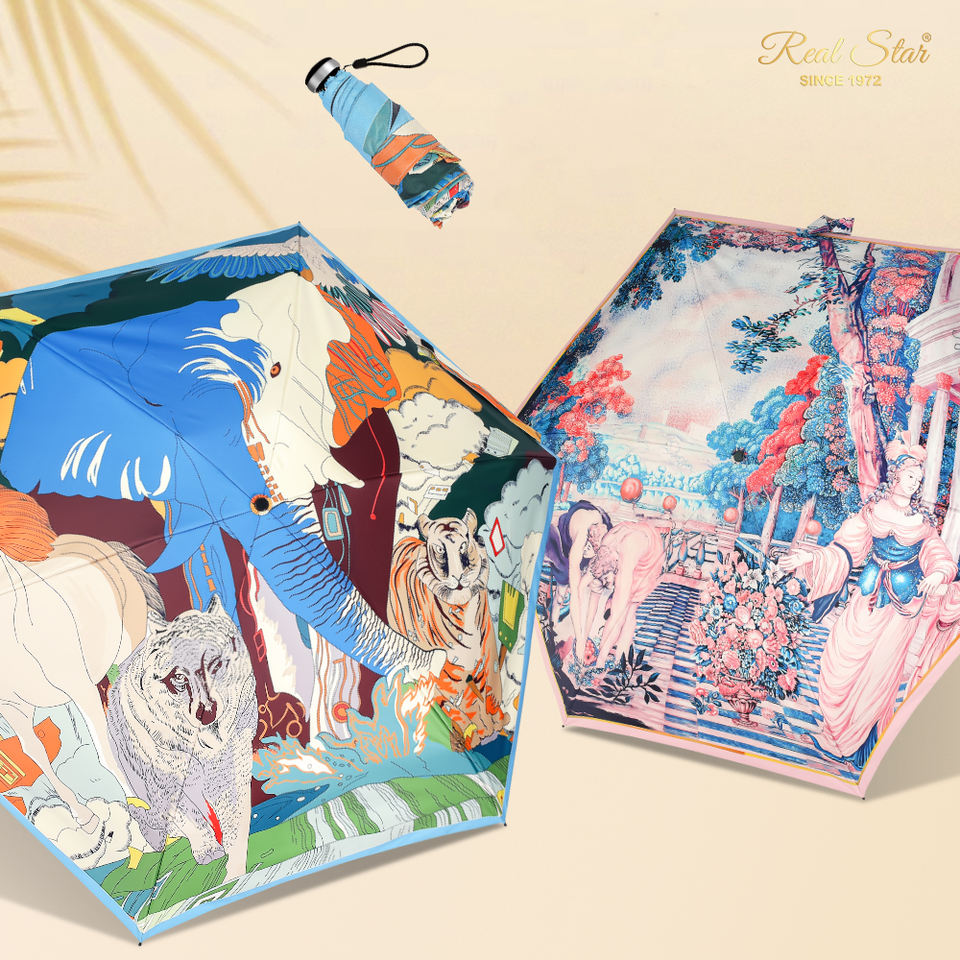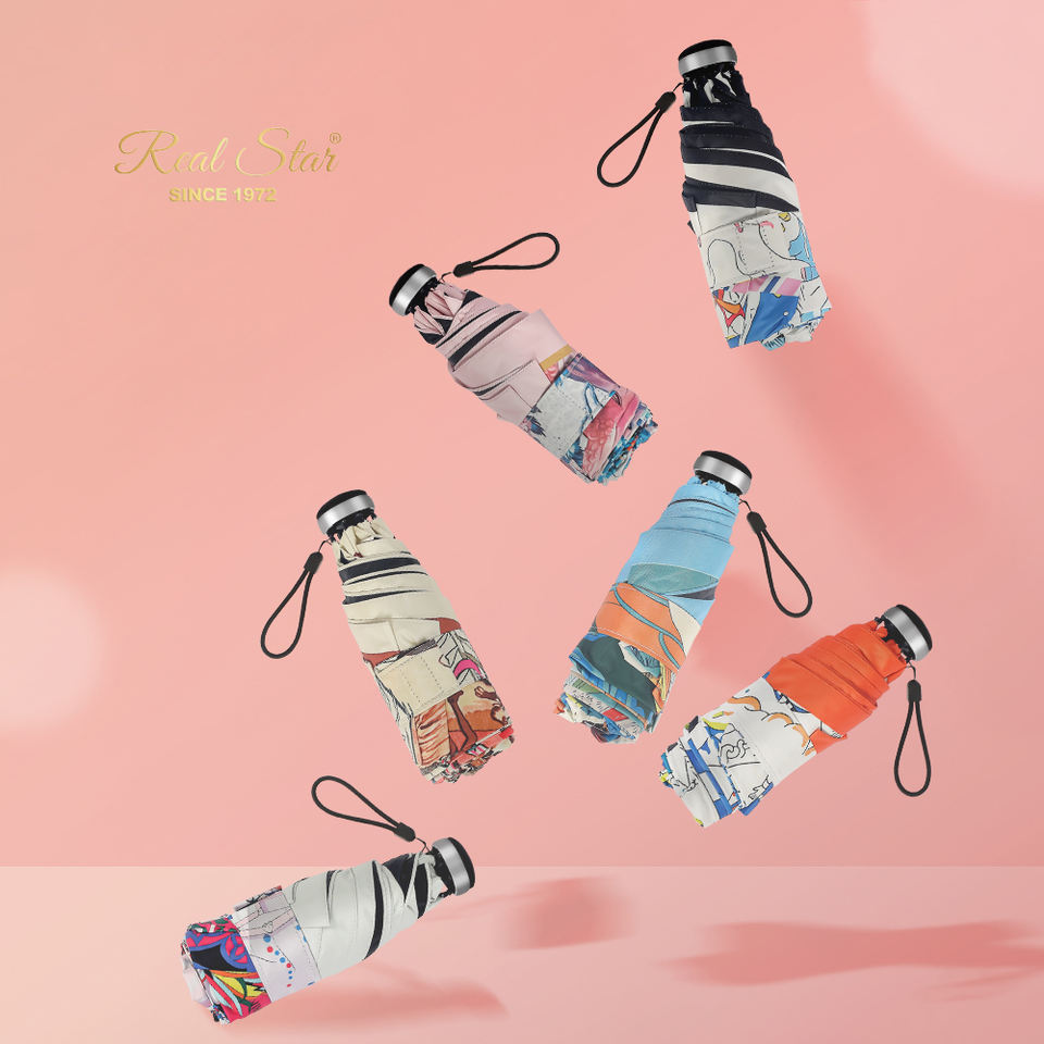 Real Star UPF50 + parapluie pour femme de haute qualité à impression globale à cinq plis joli sac à main petit mini parasol parasol