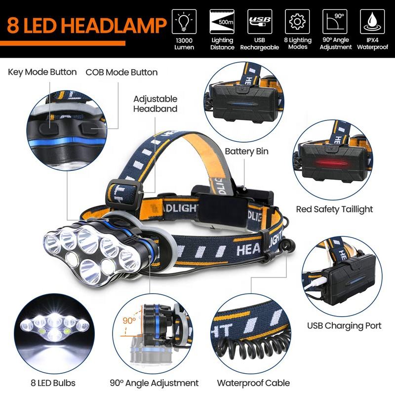 Lampe frontale portable Rechargeable par USB, 8 Modes d'éclairage, idéal pour le Camping, le cyclisme, la course à pied et la pêche